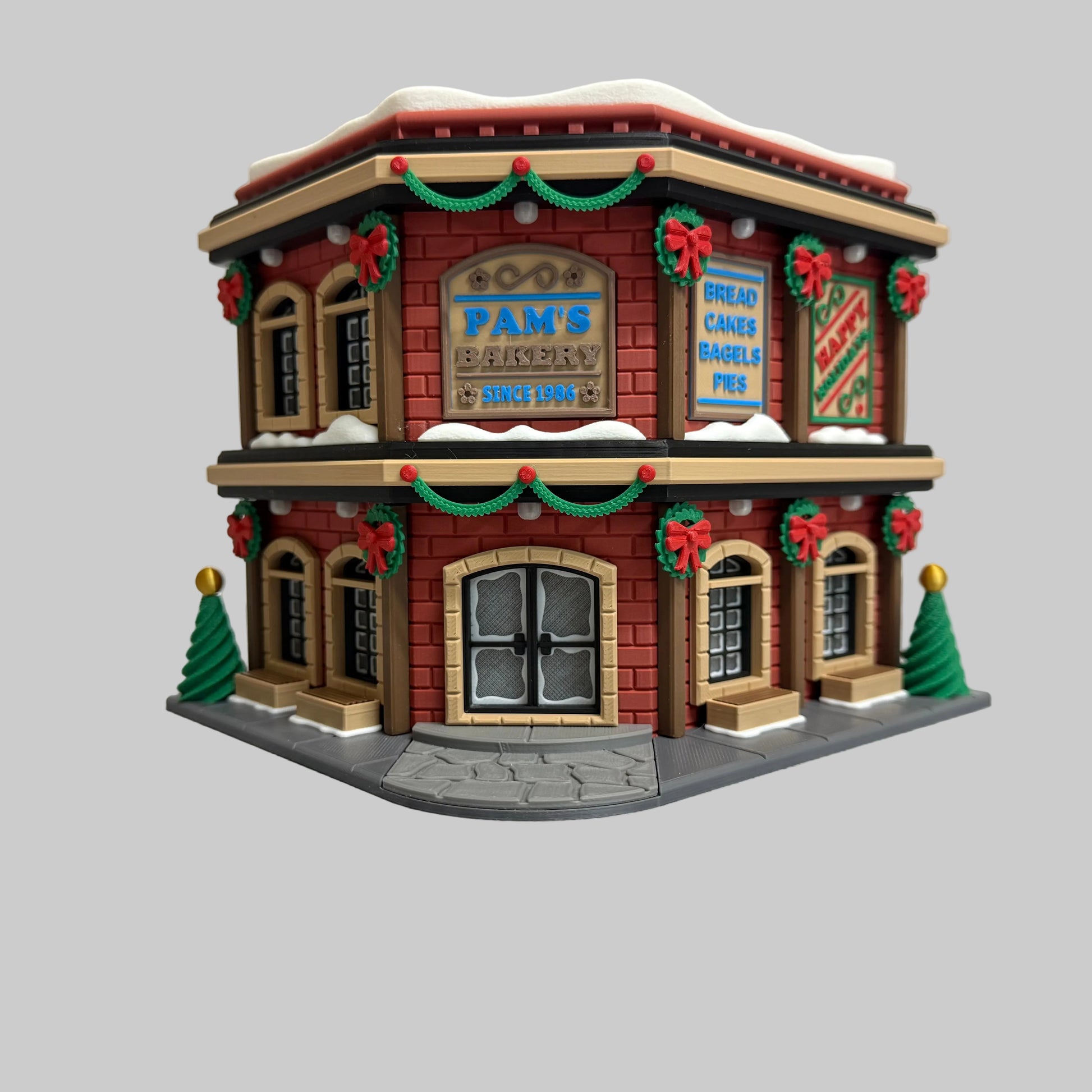 This exquisite holiday bakery model combines festive charm with architectural sophistication. Adorned with seasonal decorations—garland, wreaths, and holiday embellishments—the miniature storefront evokes the magic of a traditional patisserie during the most wonderful time of year. Integrated tealights cast a warm, inviting glow throughout the interior, illuminating the intricate details and creating an enchanting focal point for holiday displays. The craftsmanship captures authentic bakery elements while the festive styling makes it an ideal centerpiece for seasonal décor. Perfect for collectors, holiday enthusiasts, or anyone seeking to infuse their space with timeless elegance and the cozy ambiance of a beloved neighborhood bakery during the holidays.